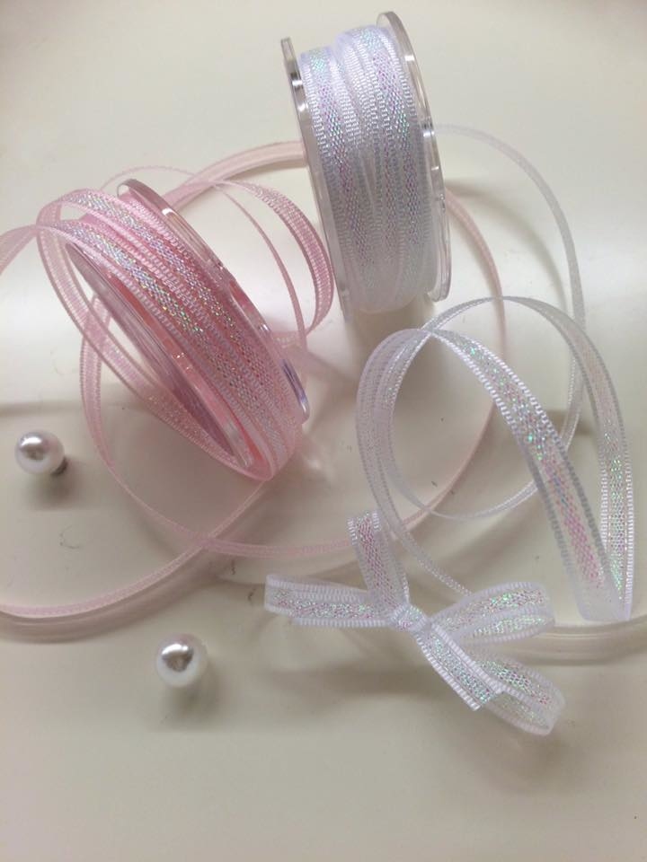 極細版緞帶,中間為珠光細蔥網紗編織而成,在光線下閃動著不同的光芒。