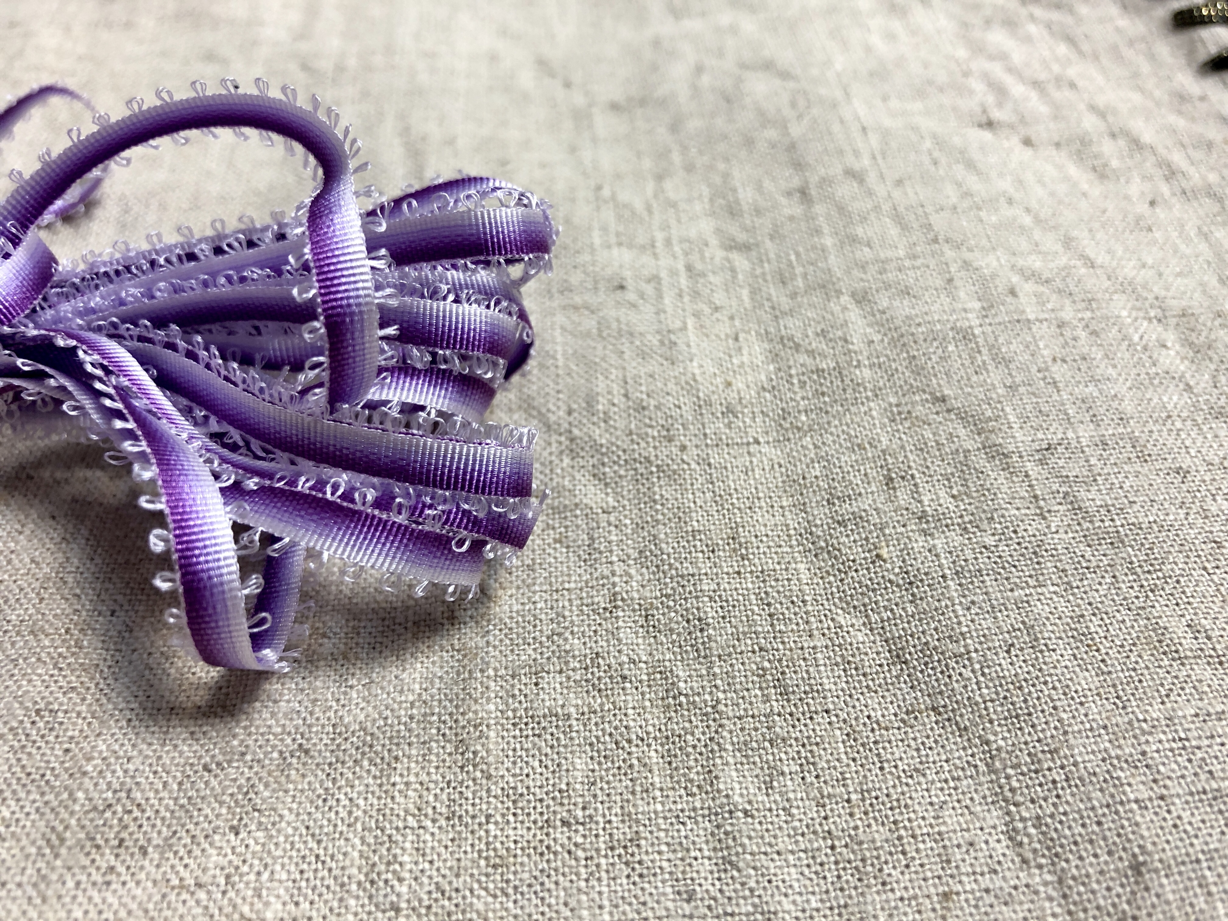 細緻柔軟的特殊花樣織編,形成連續的小圈在段染仿絲帶上,讓作品增添活潑氣息