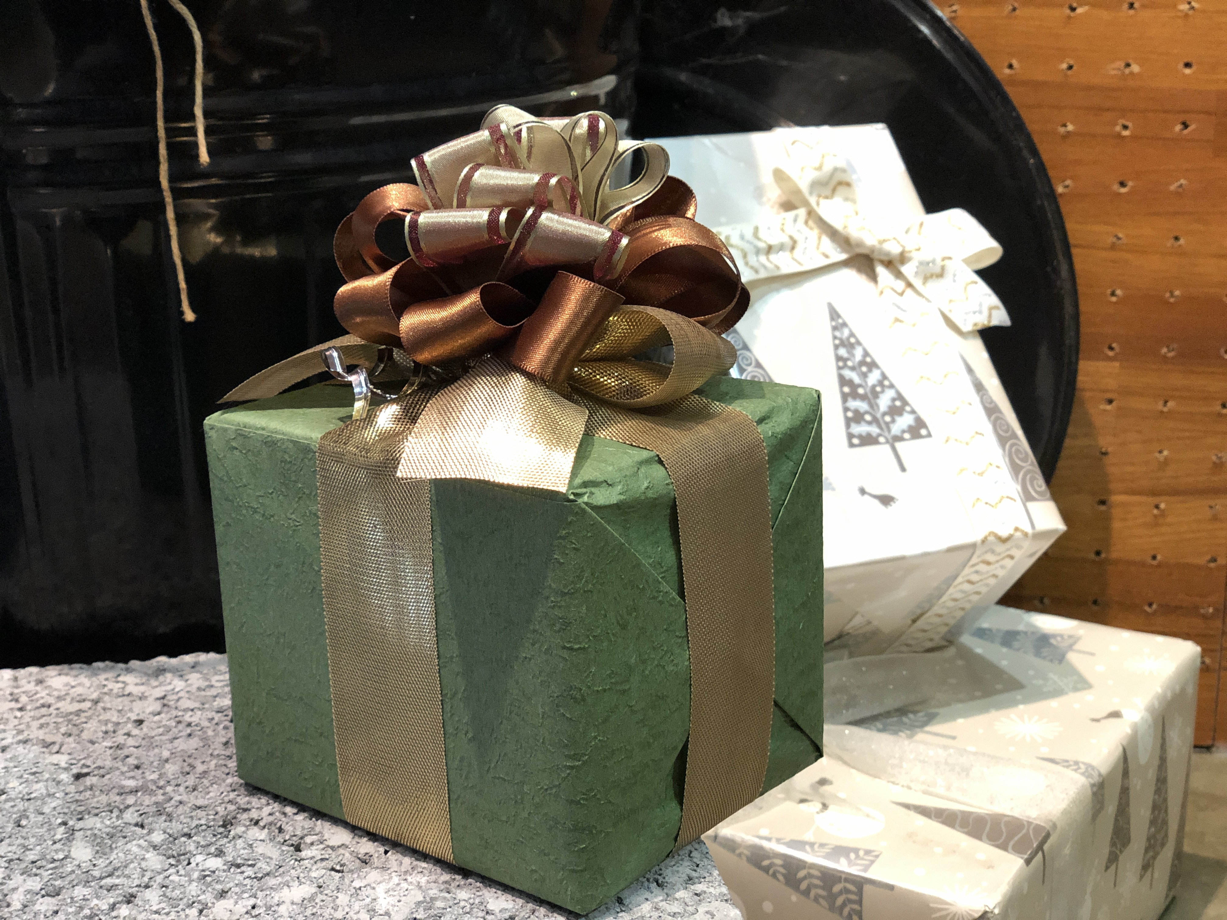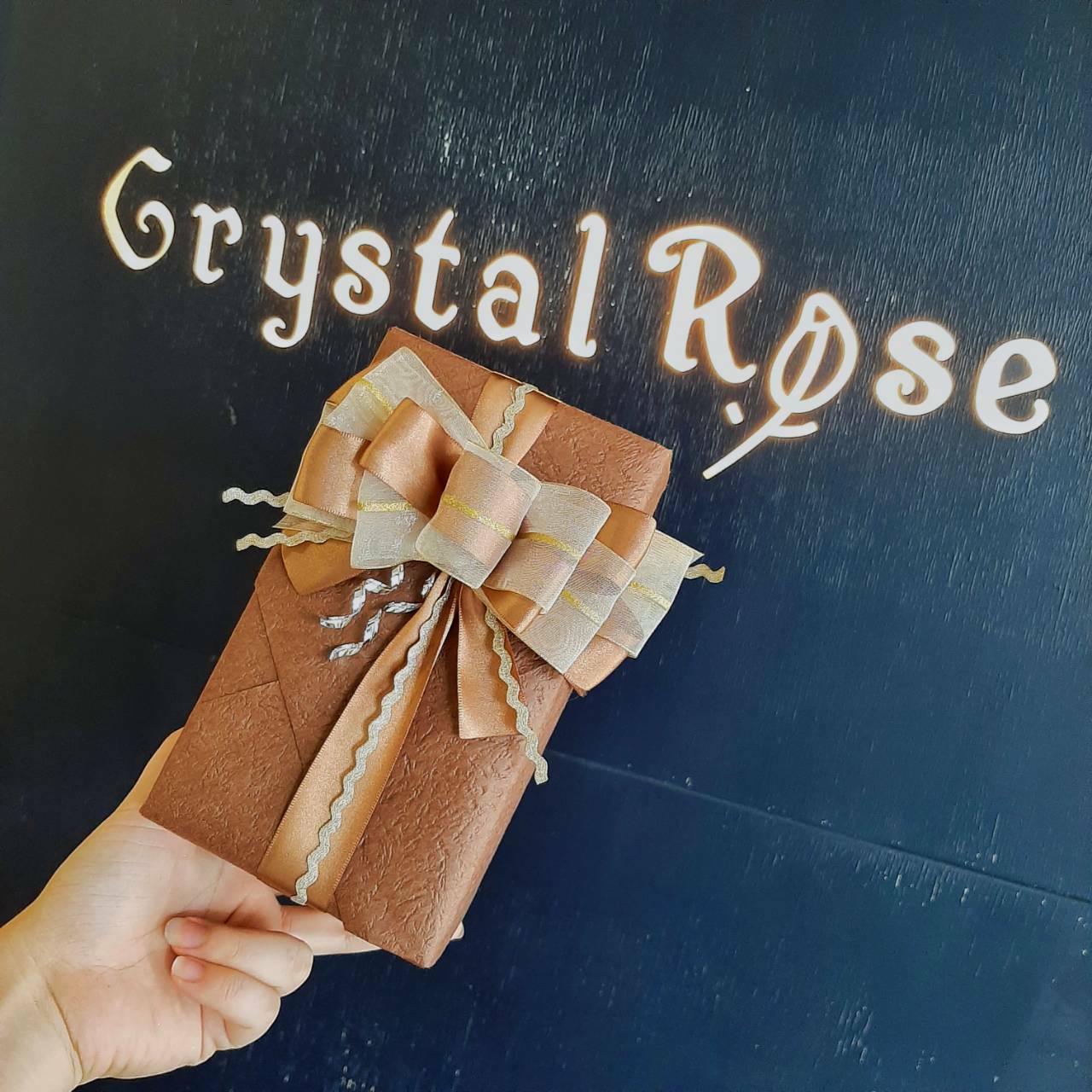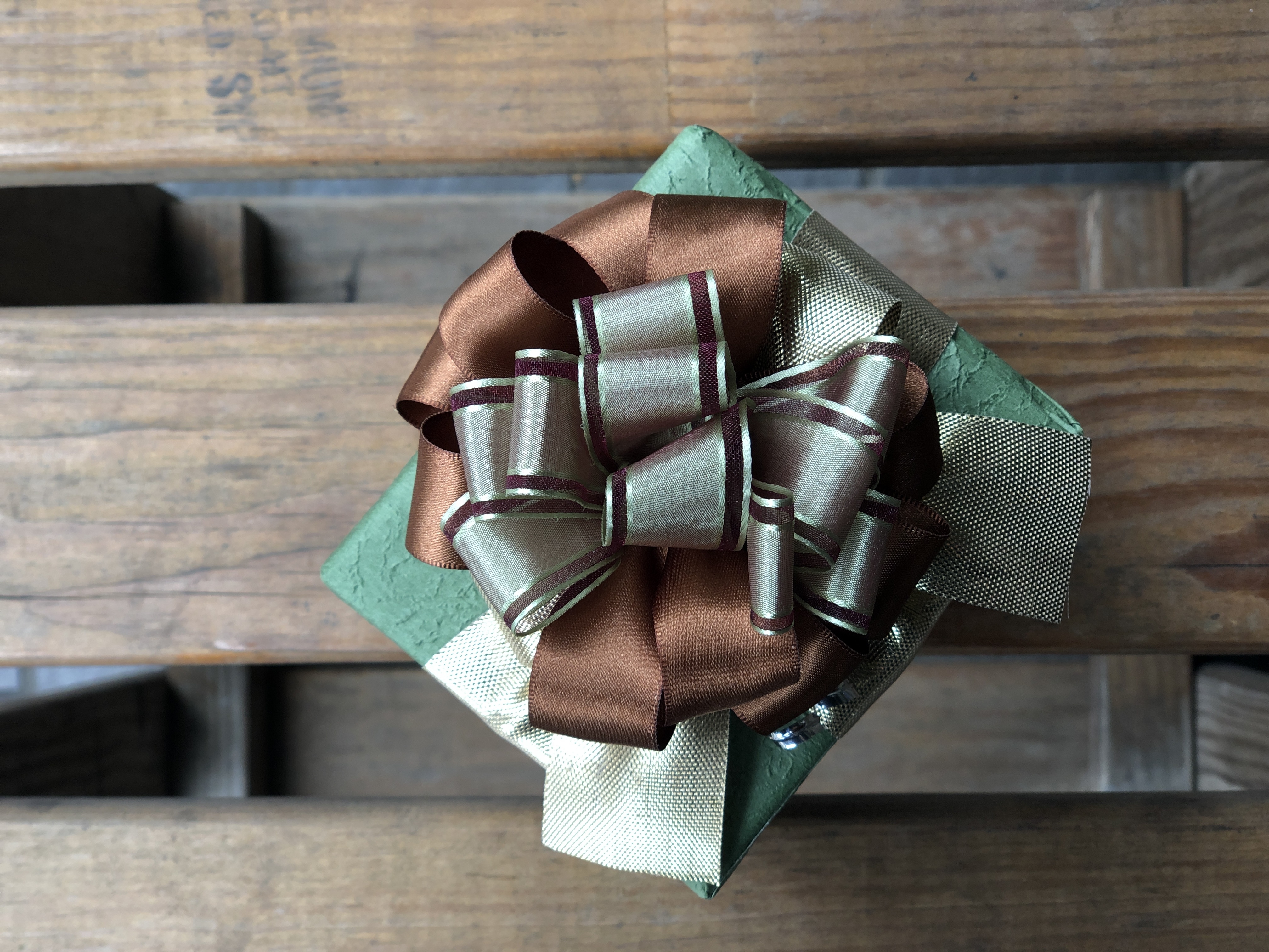 內有柳葉綠薄光宮廷緞帶,搭配不同寬度雙緞面緞帶(巧克力、柳葉綠)、古金色經典網紗、金蔥帶和巧克力色霧金網紗